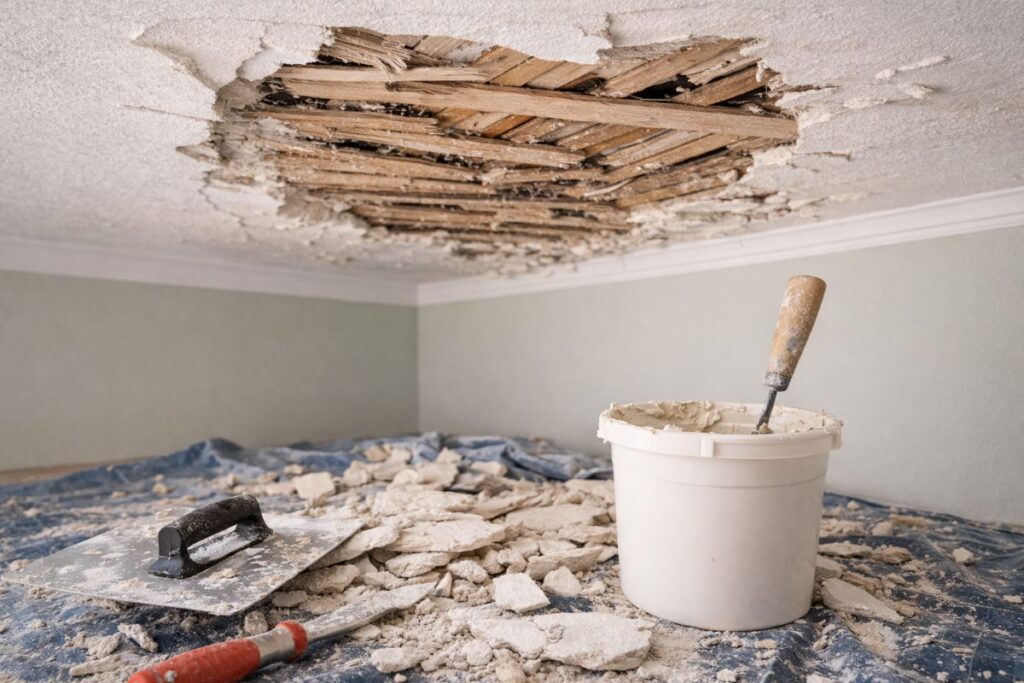 Pourquoi ces dégâts surviennent-ils ? L’humidité reste l’ennemi numéro un du bois et du plâtre. Elle fait pourrir les lattes ou gonfler la matière. Le poids devient aussi excessif avec les décennies.